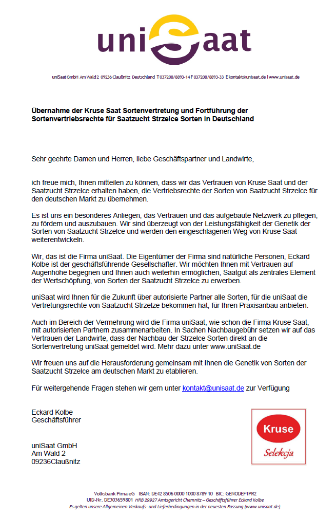 nutzen dürfen. Die Saatzucht Strzelce begrüßt diese Regelung und wird die Firma uniSaat in ihren Aktivitäten